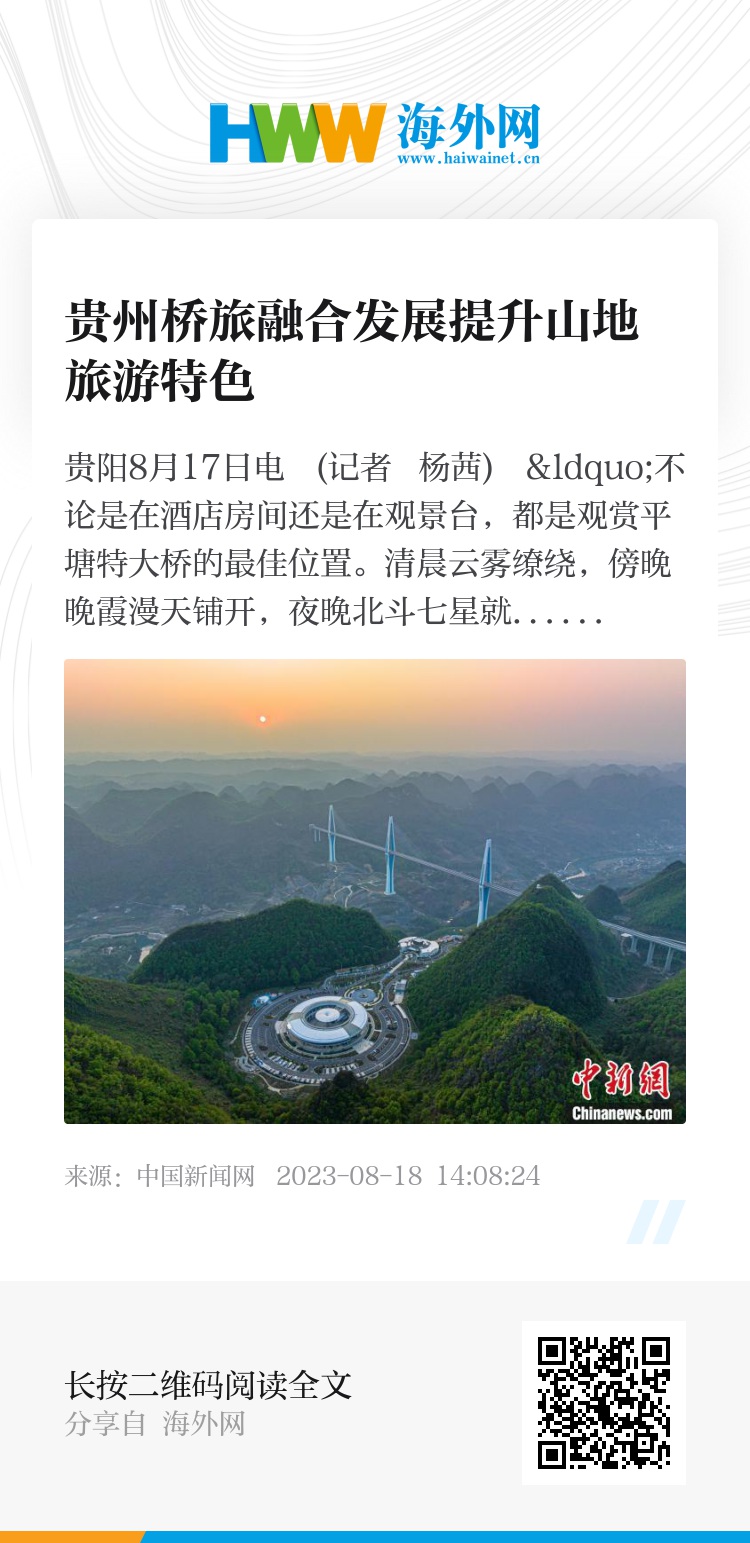 贵州省交通运输厅党委书记、厅长邱祯国介绍,贵州依托世界级桥梁的独特优势和交通基础设施优势,厚植旅游发展要素,加快推进桥旅、路旅、航旅、交邮、交产“五大融合”,点线面结合推进交旅融合业态升级,推出了一批桥旅融合“网红打卡地”。