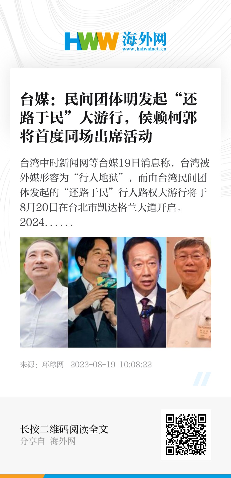 台湾中时新闻网等台媒19日消息称,台湾被外媒形容为“行人地狱”,而由台湾民间团体发起的“还路于民”行人路权大游行将于8月20日在台北市凯达格兰大道开启。2024年台湾地区领导人选举国民党参选人侯友宜、民众党参选人柯文哲17日都表示会参加,民进党主席赖清德18日也称将参加游行,加上鸿海集团创办人郭台铭表示也会到场。报道提到,这将是侯赖柯郭4人首度同场出席活动。