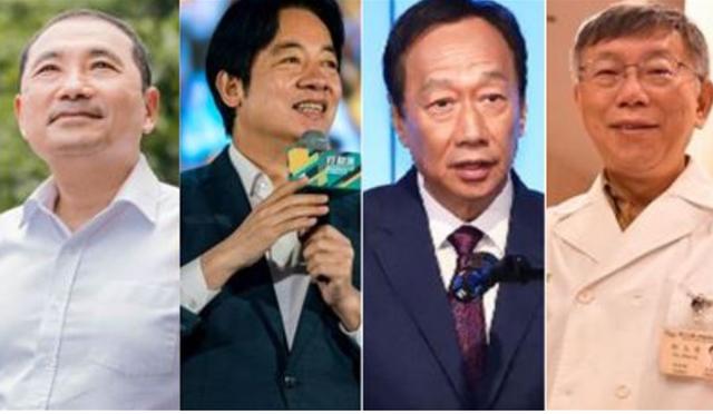 国民党参选人侯友宜(左一)、民进党主席赖清德(左二)、鸿海集团创办人郭台铭(右二)、民众党参选人柯文哲(右一)