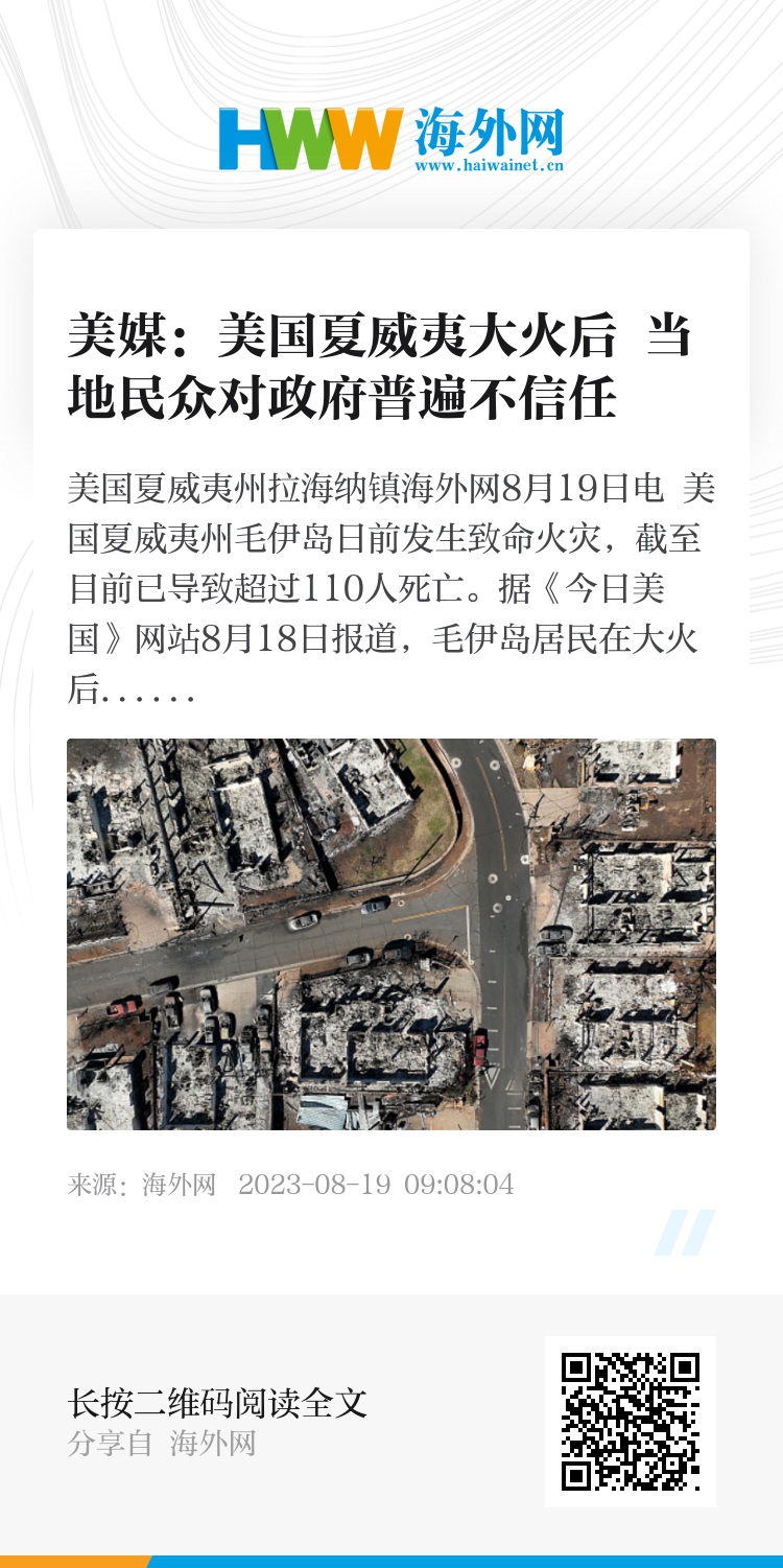 海外网8月19日电 美国夏威夷州毛伊岛日前发生致命火灾,截至目前已导致超过110人死亡。据《今日美国》网站8月18日报道,毛伊岛居民在大火后对政府普遍不信任,许多人对州和联邦政府缺乏反应和透明度感到沮丧。