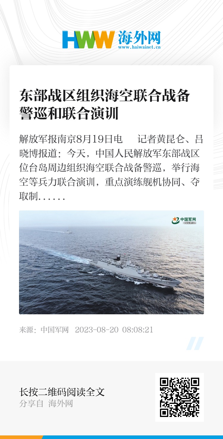 解放军报南京8月19日电 记者黄昆仑、吕晓博报道:今天,中国人民解放军东部战区位台岛周边组织海空联合战备警巡,举行海空等兵力联合演训,重点演练舰机协同、夺取制权、搜潜反潜等科目,检验战区部队联合作战实战能力。东部战区新闻发言人施毅陆军大校表示,这是对“台独”分裂势力与外部势力勾连挑衅的严重警告。