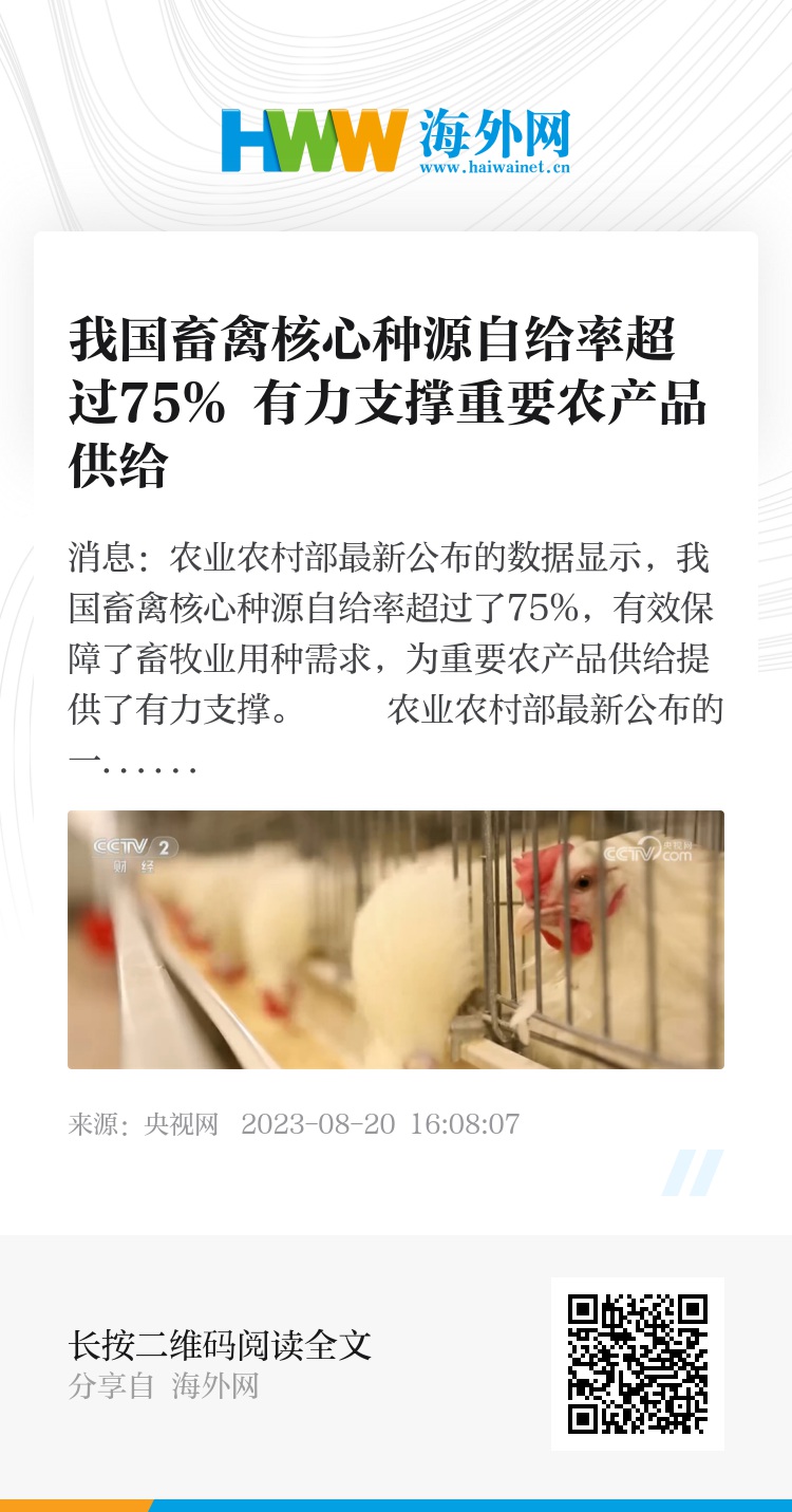 央视网消息:农业农村部最新公布的数据显示,我国畜禽核心种源自给率超过了75%,有效保障了畜牧业用种需求,为重要农产品供给提供了有力支撑。