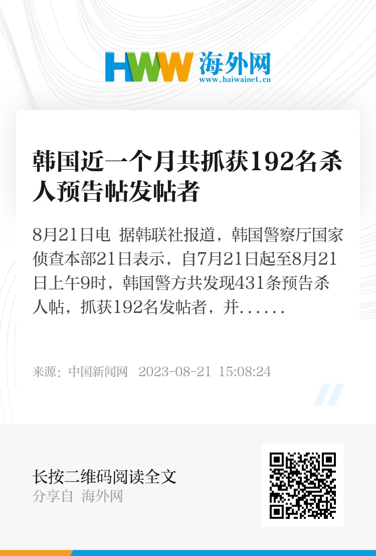 中新网8月21日电 据韩联社报道,韩国警察厅国家侦查本部21日表示,自7月21日起至8月21日上午9时,韩国警方共发现431条预告杀人帖,抓获192名发帖者,并逮捕其中20人。