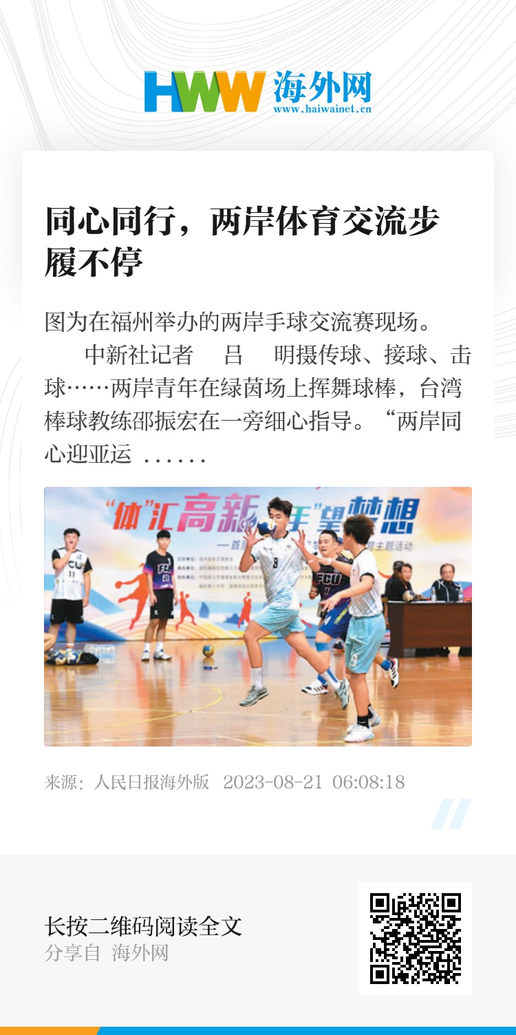 “希望未来能充分发挥自身体育运动专业优势,举办更多两岸青年活动,邀请更多台湾青年来大陆走一走、看一看,像我一样在福州追梦筑梦。”近日举办的“两岸同心 筑梦高新”两岸青年手球交流赛上,活动发起人、福建师范大学体育科学学院台籍教师张钊瑞说。