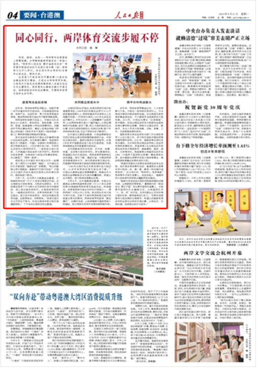 近年来,两岸体育界协同配合,创新开展一系列丰富多彩的交流活动,内容涵盖竞技体育、体育产业、运动科学、青少年体育等诸多领域,推动两岸体育交流合作不断取得新进展。