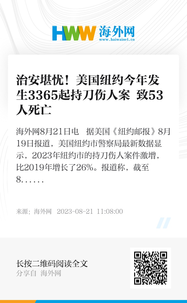 报道称,截至8月13日,纽约今年已经发生3365起持刀伤人案件,而2019年为2666起。这一数字也比2022年同期增加了5%,2022年发生了3208起持刀伤人案件。2023年以来持刀伤人案件已造成53人死亡,这比2019年的41人增加了29%。