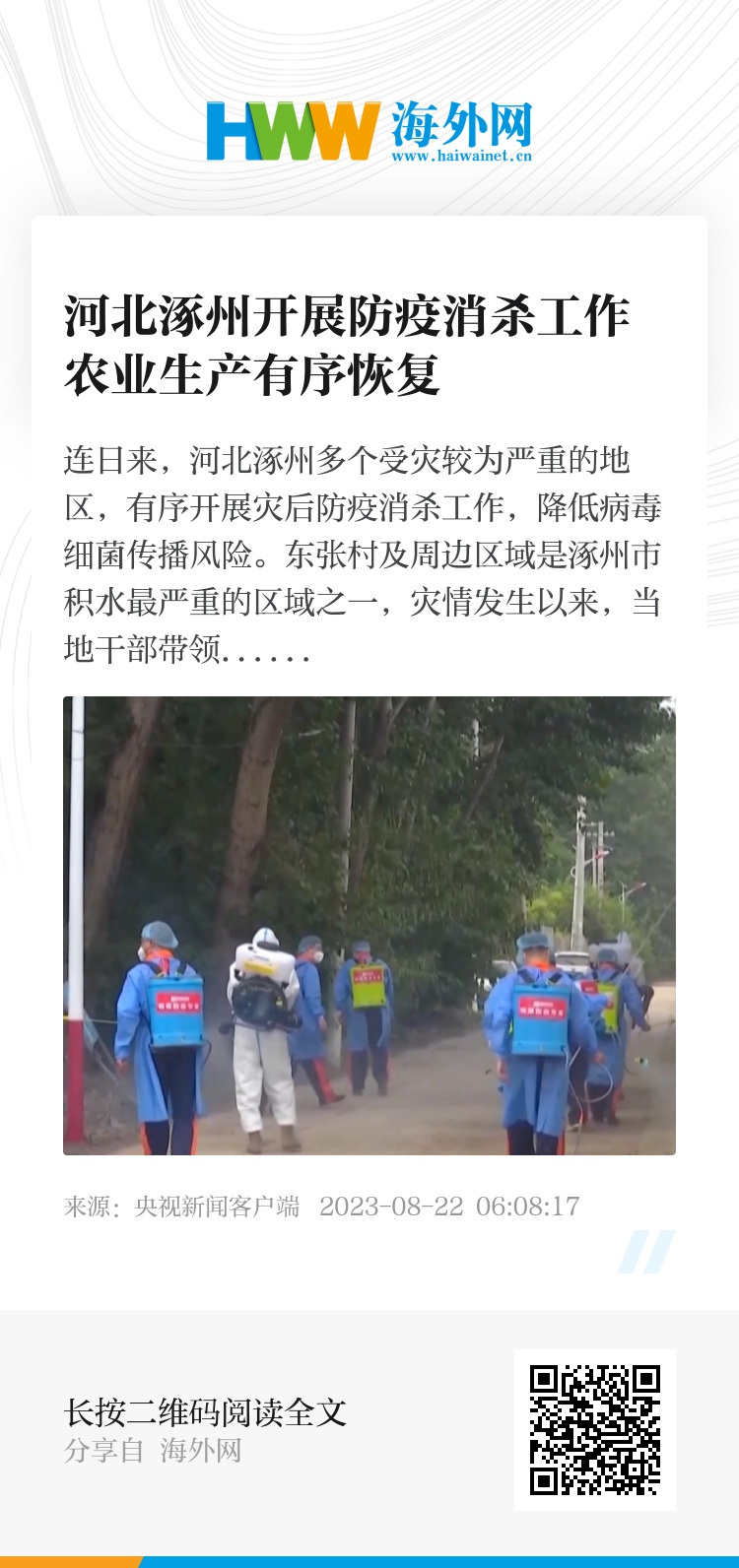 连日来,河北涿州多个受灾较为严重的地区,有序开展灾后防疫消杀工作,降低病毒细菌传播风险。
