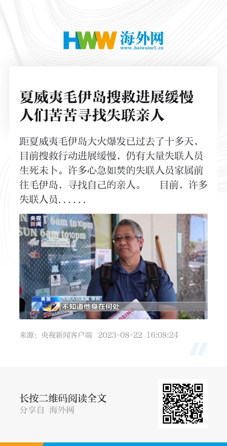 距夏威夷毛伊岛大火爆发已过去了十多天,目前搜救行动进展缓慢,仍有大量失联人员生死未卜。许多心急如焚的失联人员家属前往毛伊岛,寻找自己的亲人。