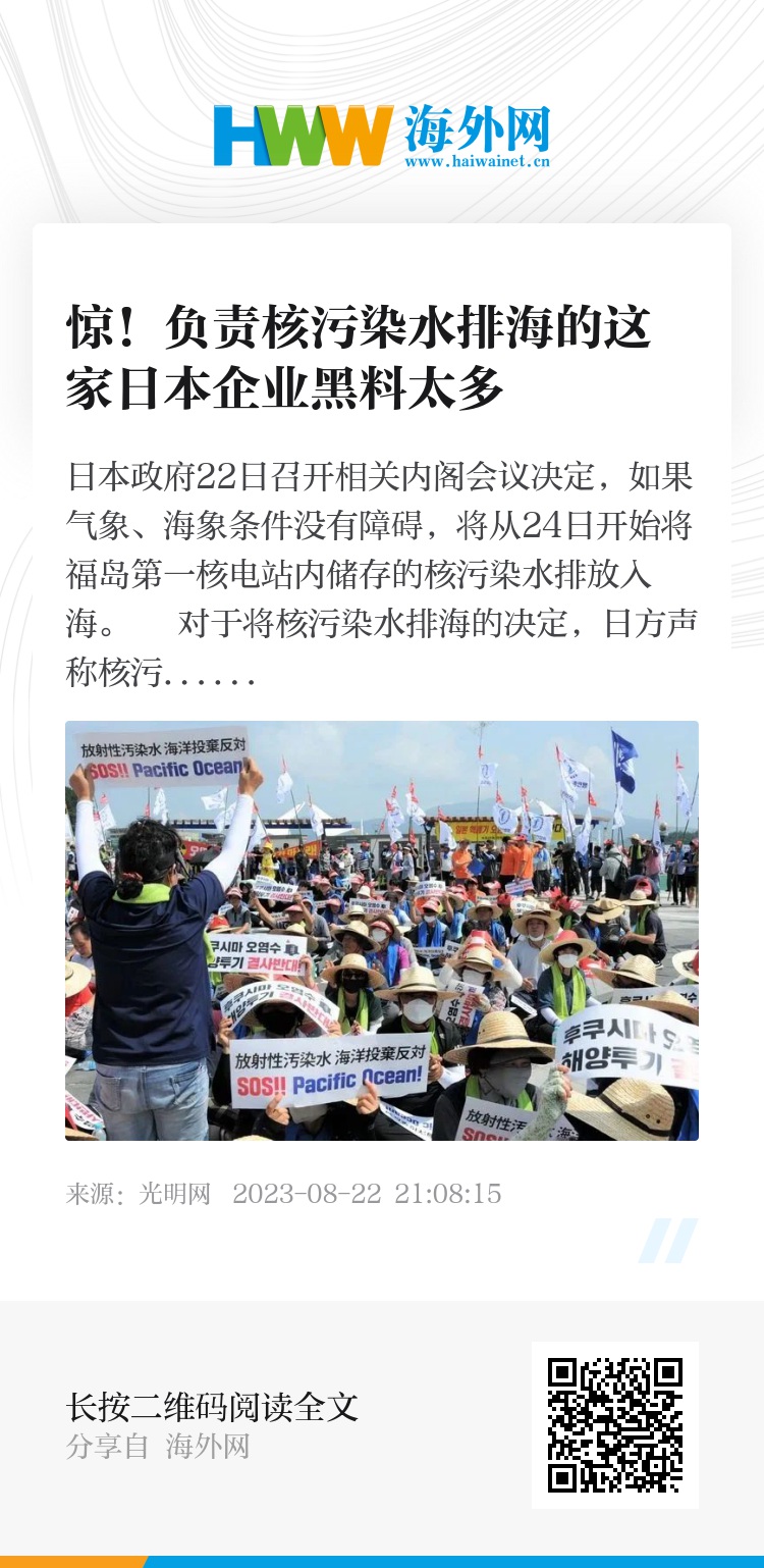 日本政府22日召开相关内阁会议决定,如果气象、海象条件没有障碍,将从24日开始将福岛第一核电站内储存的核污染水排放入海。