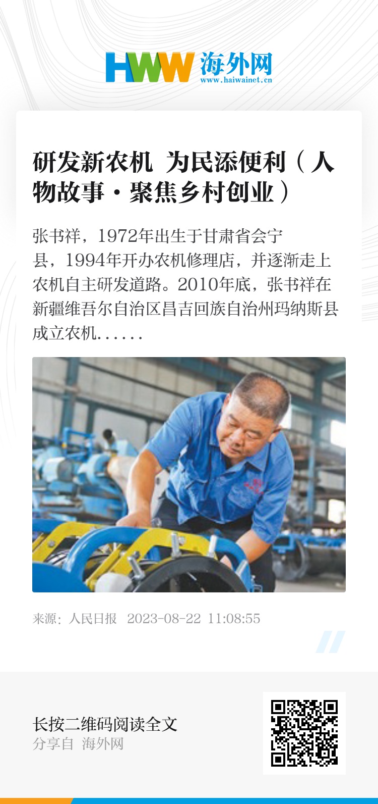 前阵子,张书祥带着自己研发的农机参加了新疆农业机械博览会。看着高低大小各不相同的国产农机摆满了现场,他的自豪感油然而生,“很多现代化农机是一线人员共同努力研制的成果,每次想到这其中有我的参与,就很有成就感。”现在,张书祥还在持续钻研具有信息获取、智能决策和精准作业能力的新一代农机装备。(人民日报记者 李亚楠)
