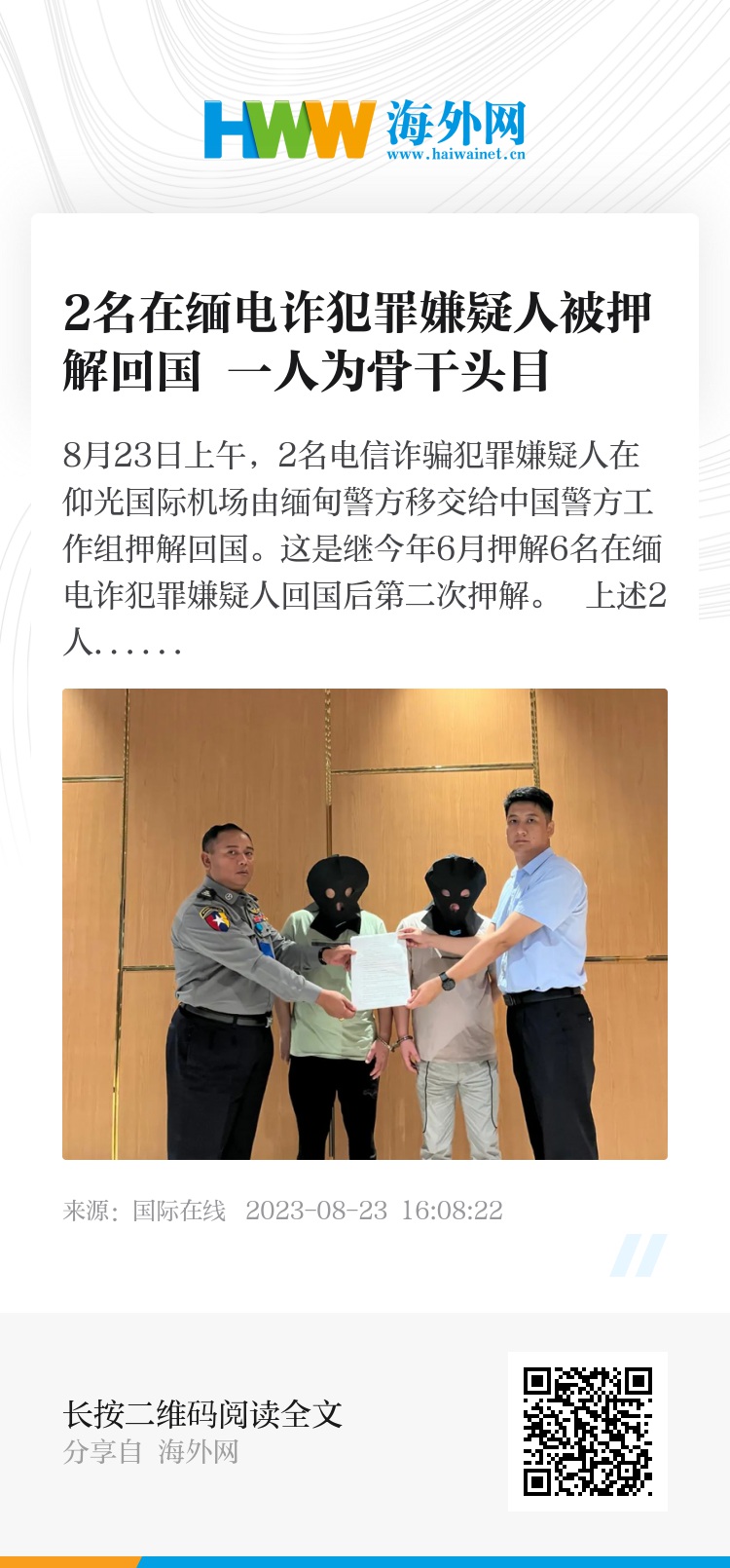 8月23日上午,2名电信诈骗犯罪嫌疑人在仰光国际机场由缅甸警方移交给中国警方工作组押解回国。这是继今年6月押解6名在缅电诈犯罪嫌疑人回国后第二次押解。
