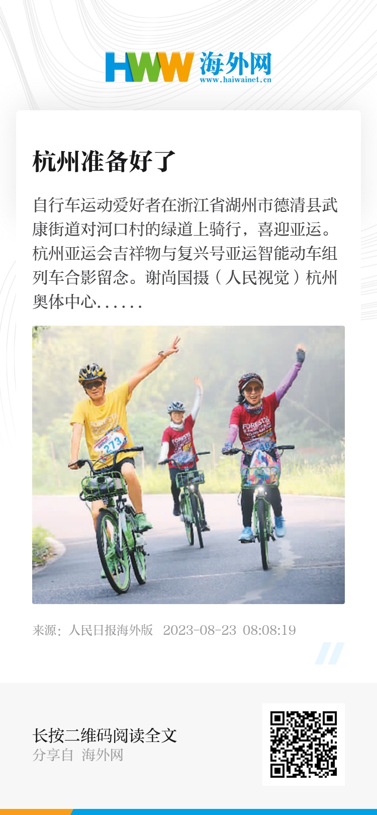 竞赛场馆静待来客、体育健儿摩拳擦掌、城市张开热情怀抱……在“心心相融,爱达未来”的期盼中,中国人民充满信心,将在杭州举办一届精彩纷呈的亚运会。
