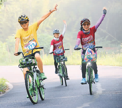 自行车运动爱好者在浙江省湖州市德清县武康街道对河口村的绿道上骑行,喜迎亚运。