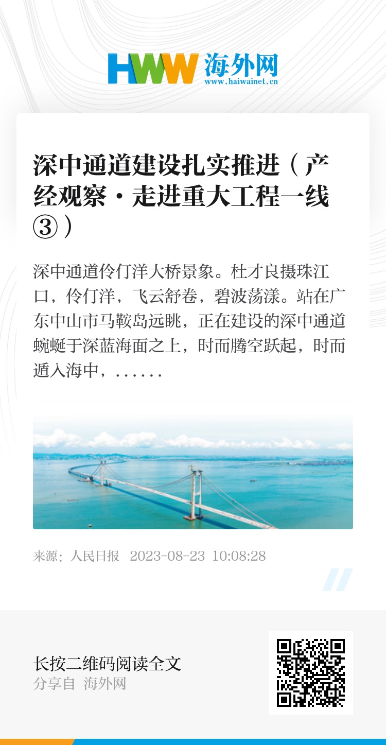 站在广东中山市马鞍岛远眺,正在建设的深中通道蜿蜒于深蓝海面之上,时而腾空跃起,时而遁入海中,穿行24公里,通向深圳前海。继港珠澳大桥后,这一集“隧、岛、桥、水下互通”于一体的超大型跨海通道将再次刷新多项世界纪录。