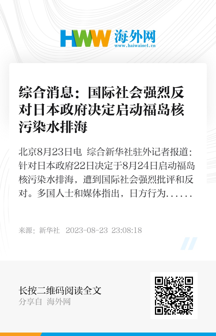 新华社北京8月23日电 综合新华社驻外记者报道:针对日本政府22日决定于8月24日启动福岛核污染水排海,遭到国际社会强烈批评和反对。多国人士和媒体指出,日方行为极不负责、危害无穷,敦促其立即撤回排海决定。