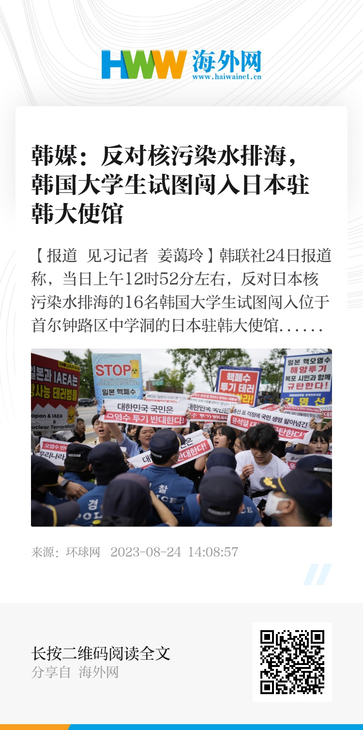 【环球网报道 见习记者 姜蔼玲】韩联社24日报道称,当日上午12时52分左右,反对日本核污染水排海的16名韩国大学生试图闯入位于首尔钟路区中学洞的日本驻韩大使馆时被警方逮捕。报道称,这些学生高喊着谴责日本排放核污染水的口号,试图闯入日本驻韩大使馆。