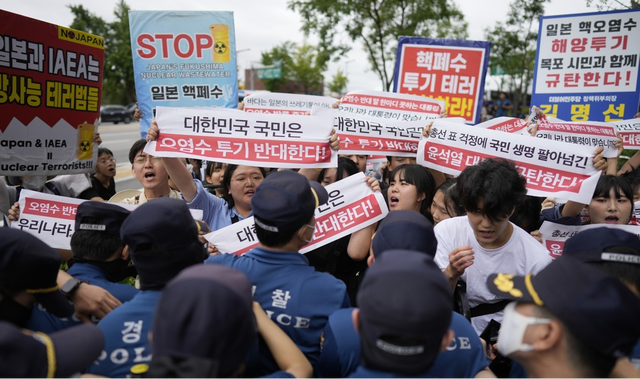 图为8月24日,示威者在日本驻韩国大使馆前谴责福岛污染水的排放。图源:韩媒