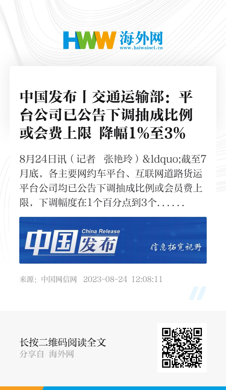 中国网8月24日讯(记者 张艳玲)“截至7月底,各主要网约车平台、互联网道路货运平台公司均已公告下调抽成比例或会员费上限,下调幅度在1个百分点到3个百分点。”交通运输部运输服务司副司长韩敬华24日在交通运输部举行的新闻发布会上说。