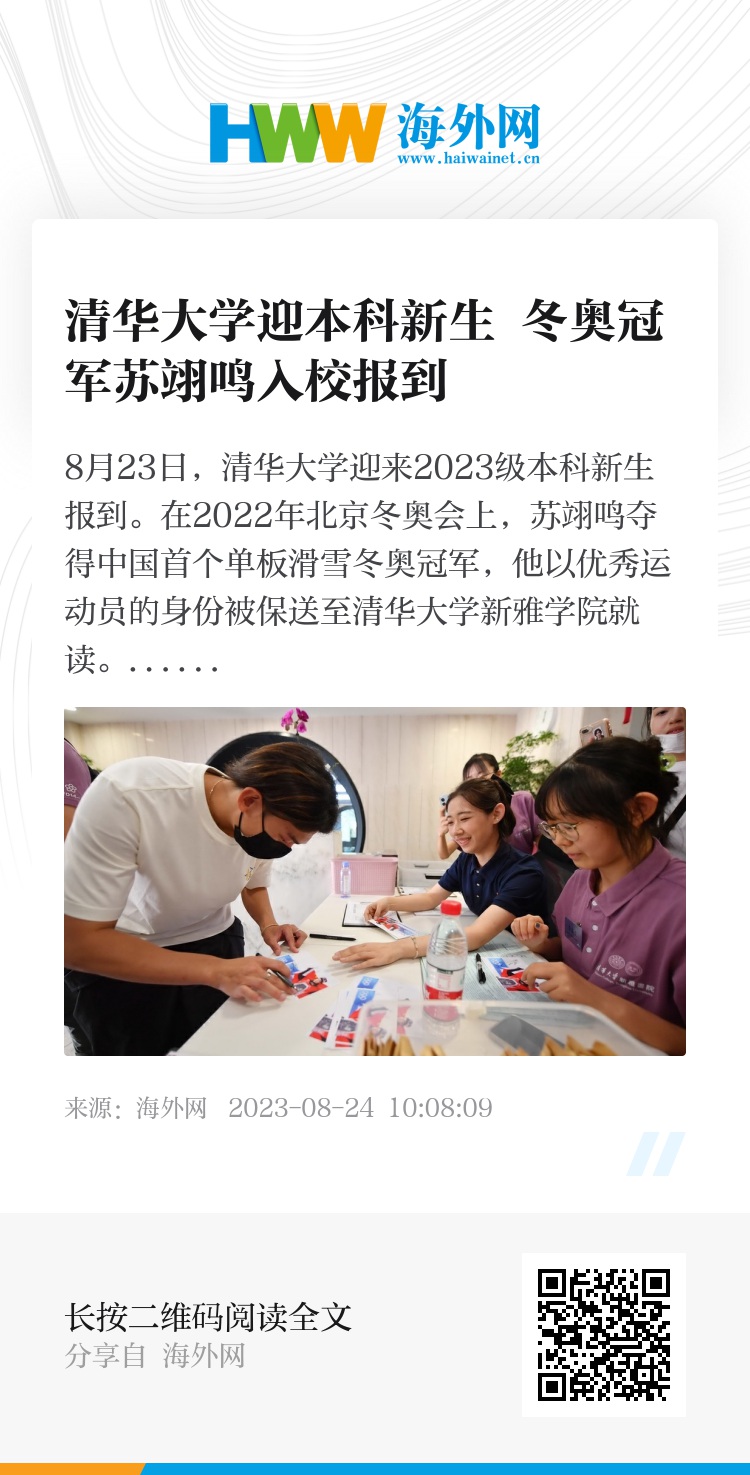 8月23日,清华大学迎来2023级本科新生报到。在2022年北京冬奥会上,苏翊鸣夺得中国首个单板滑雪冬奥冠军,他以优秀运动员的身份被保送至清华大学新雅学院就读。图片来源:IC photo