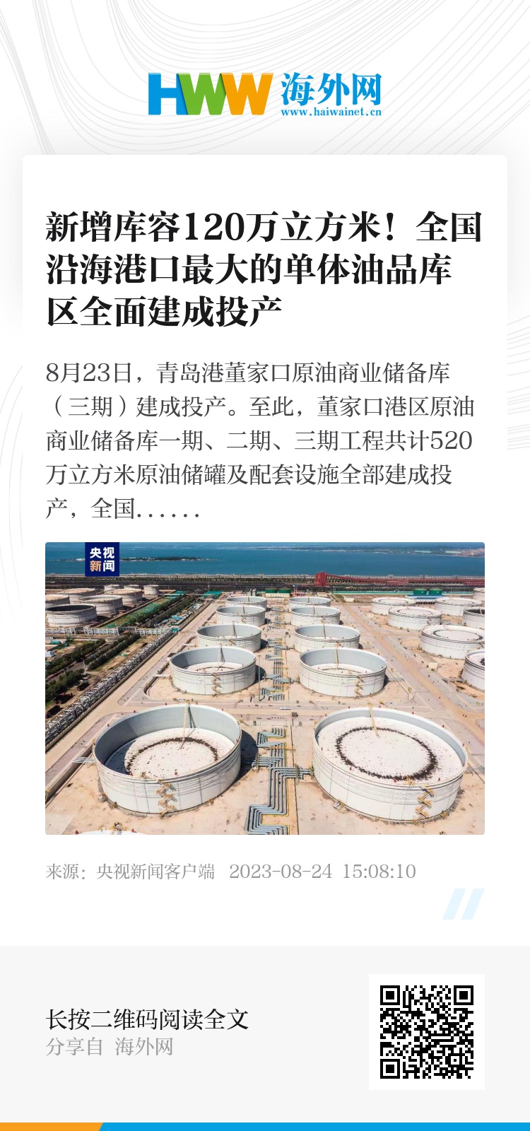 据了解,本次投产的三期工程与董家口港区已建成投用库区互联互通,共同形成总库容达到1106万立方米的原油罐群,通过与董家口港区原油码头一、二期四个超大型泊位以及董家口-潍坊-鲁中鲁北原油长输管道有机相连,在一体化运营管理的模式下,具备高效接收与转输能力,项目投产后,将进一步提升董家口港区的油品储运能力,巩固青岛港全国原油进口大港的地位,为腹地石化企业供应原油、燃料油和稀释沥青等原料提供强有力保障,对完善青岛港油品生产布局和结构,有效抵御国际石油市场冲击、保障山东炼化产业平稳运行、服务区域经济高质量发展、促进港产城融合发展等方面具有重要意义。(总台记者 王伟 柳栋)
