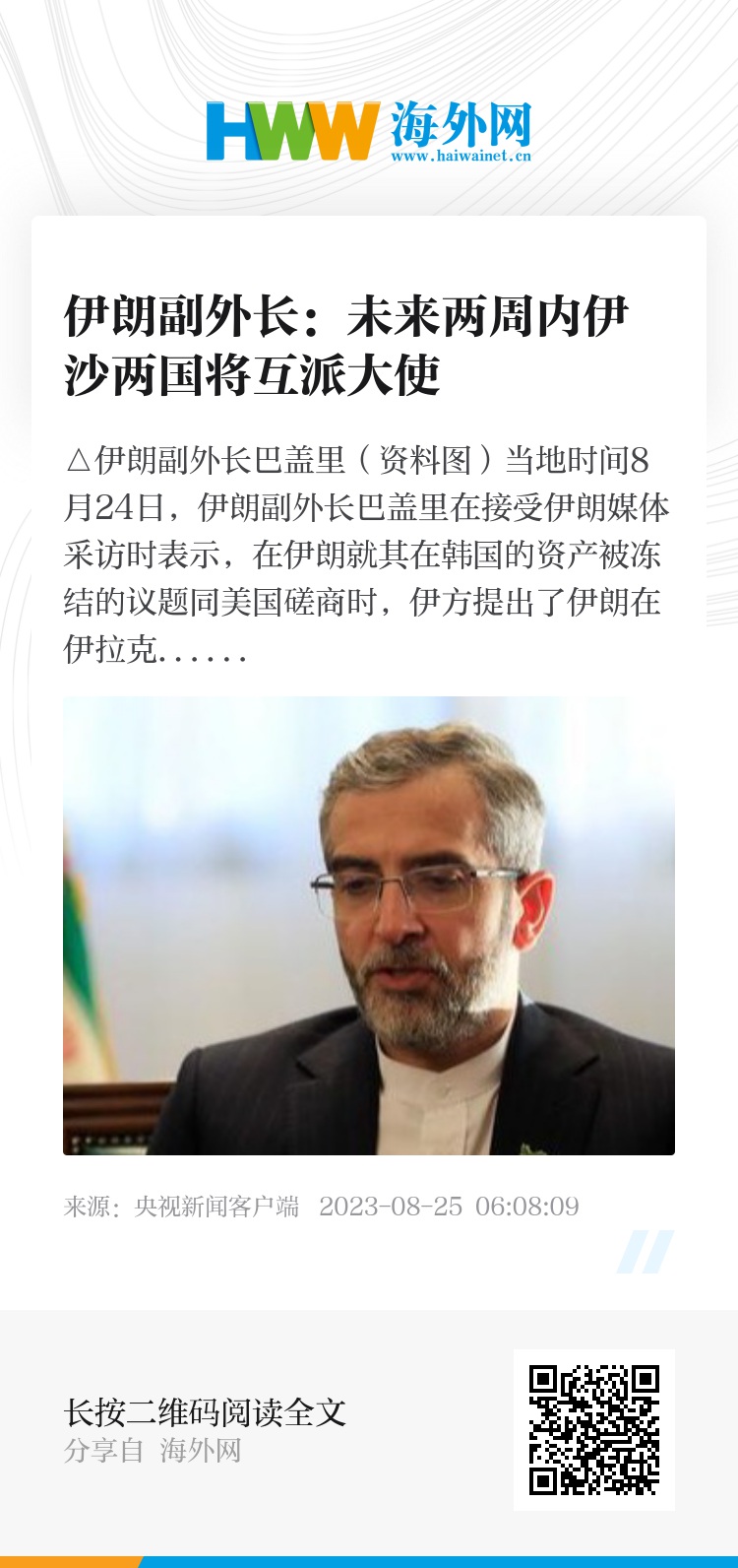 此外,巴盖里表示,未来两周内,伊朗和沙特将互派大使。他表示,伊朗与地区国家实现了关系稳定,地区国家在政治、经济、安全等领域实现了合作与共赢。(总台记者 李健南)