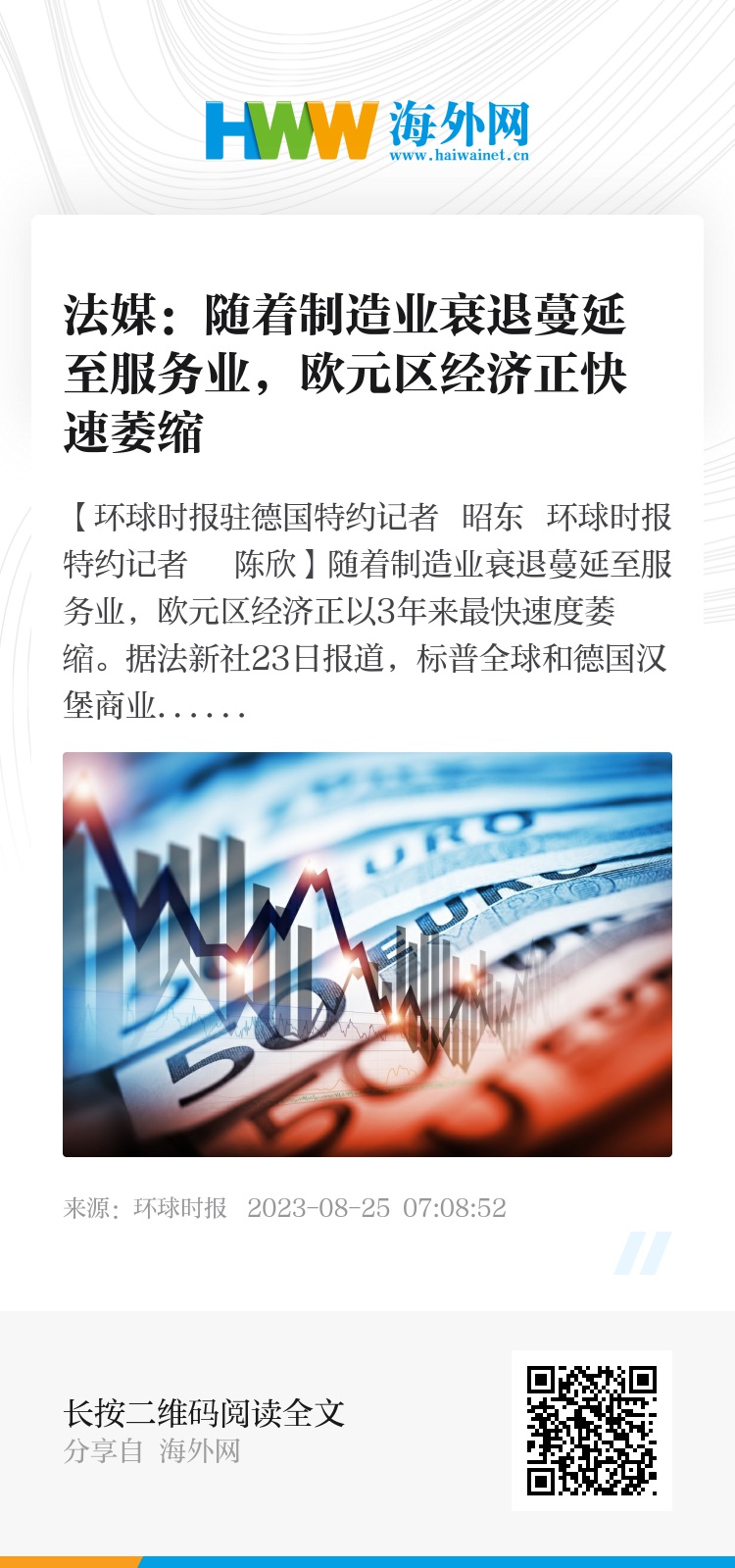 【环球时报驻德国特约记者 昭东 环球时报特约记者 陈欣】随着制造业衰退蔓延至服务业,欧元区经济正以3年来最快速度萎缩。据法新社23日报道,标普全球和德国汉堡商业银行(HCOB)当日发布的月度调查显示,8月HCOB欧元区采购经理人指数(PMI)自7月的48.6降至47(这项指数低于50代表萎缩),数据创2020年11月以来最低。同时,服务业PMI跌至48.3,自去年12月来首次出现萎缩。