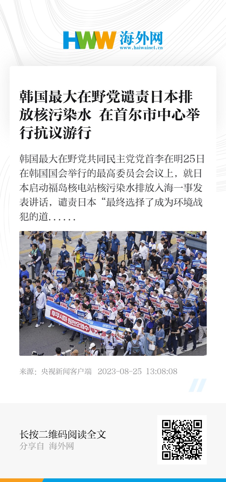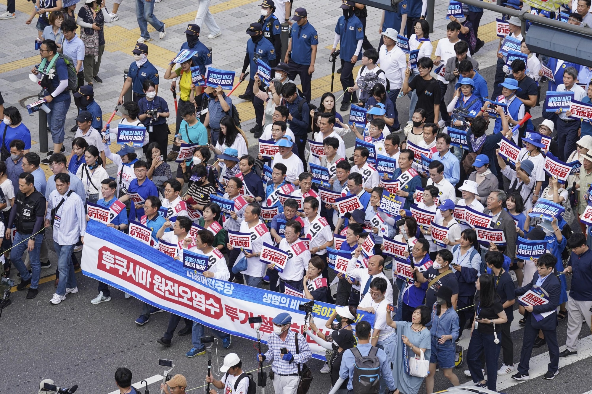 当天,共同民主党还在位于首尔市中心的光化门广场举行了“阻止福岛核电站核污染水排放入海”的国民游行。共同民主党党首李在明、院内代表朴洸瑥、共同民主党议员、党员等都参加了这一游行。参加抗议游行的人员手举“撤回福岛核电站核污染水排海”“阻止核污染水排放入海”等字样的标语,高喊“停止向海洋排放”等口号,从光化门广场一路行进到龙山总统府前,全程达5公里左右。