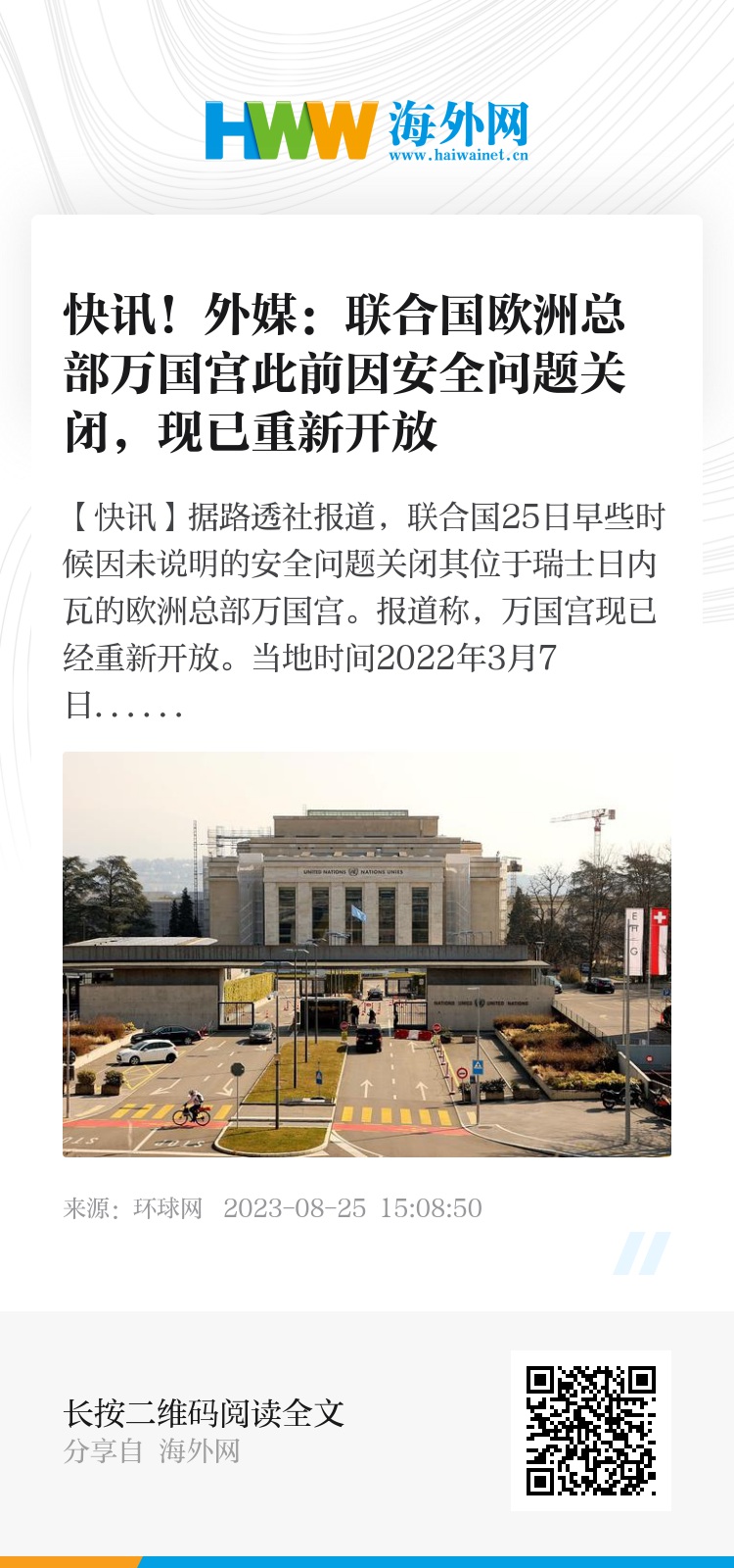 【环球网快讯】据路透社报道,联合国25日早些时候因未说明的安全问题关闭其位于瑞士日内瓦的欧洲总部万国宫。报道称,万国宫现已经重新开放。