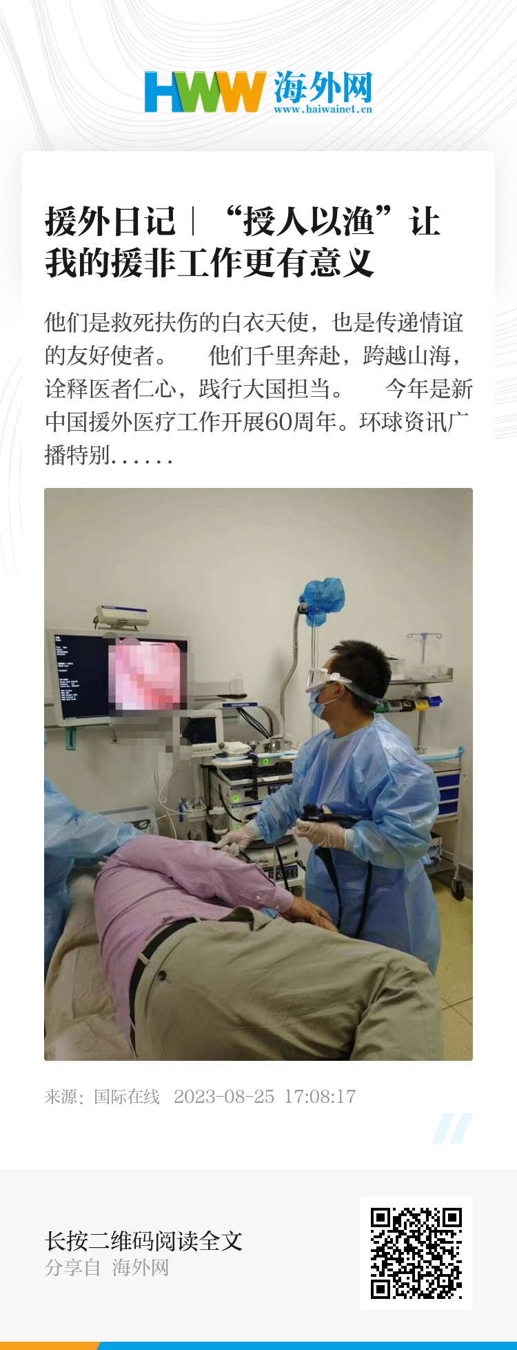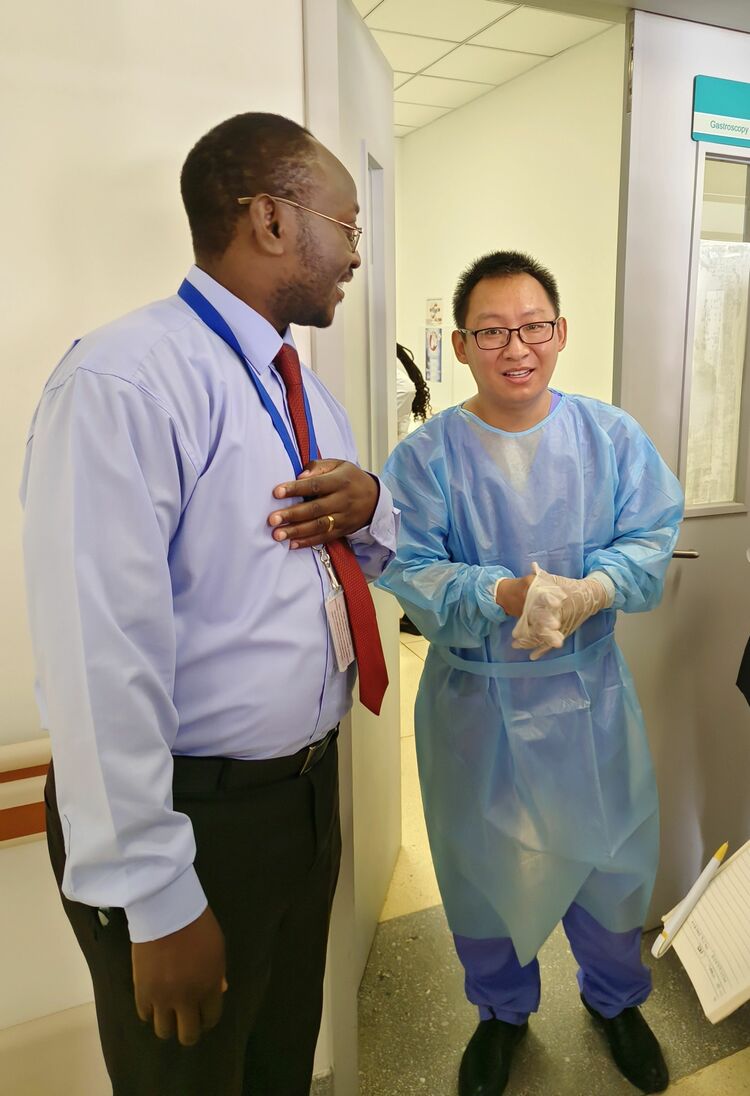由于我们工作的医院是一所我国援建的教学医院,所以日常带教也是我们医疗队的一项重要工作,时常会有本院及外院的年轻医生来这里学习胃肠镜操作,我也很乐于将我所知所学传授给他们。“授人以渔”,才能真正留下一支“带不走”的医疗队,而这也会使我的援非工作更有意义。