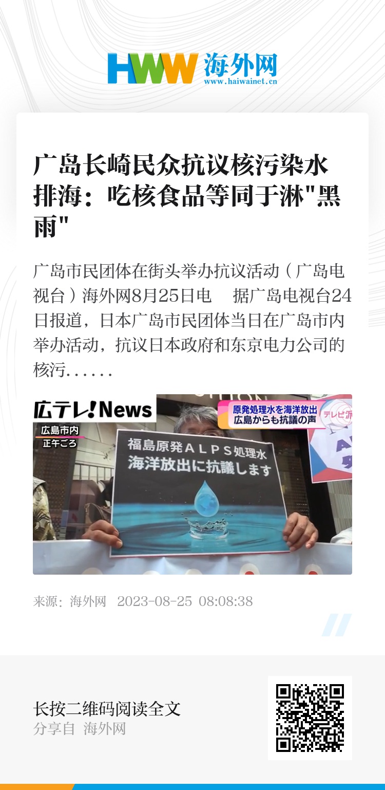 24日,日本福岛第一核电站启动核污染水排海。当日,广岛市民团体组织民众在广岛市内发起抗议活动,并组织市民签名反对。参与者说,即使政府声称排海的核污染水标准合格,但仍然含有有害物质,“即使政府认可,最终也会污染海洋。”