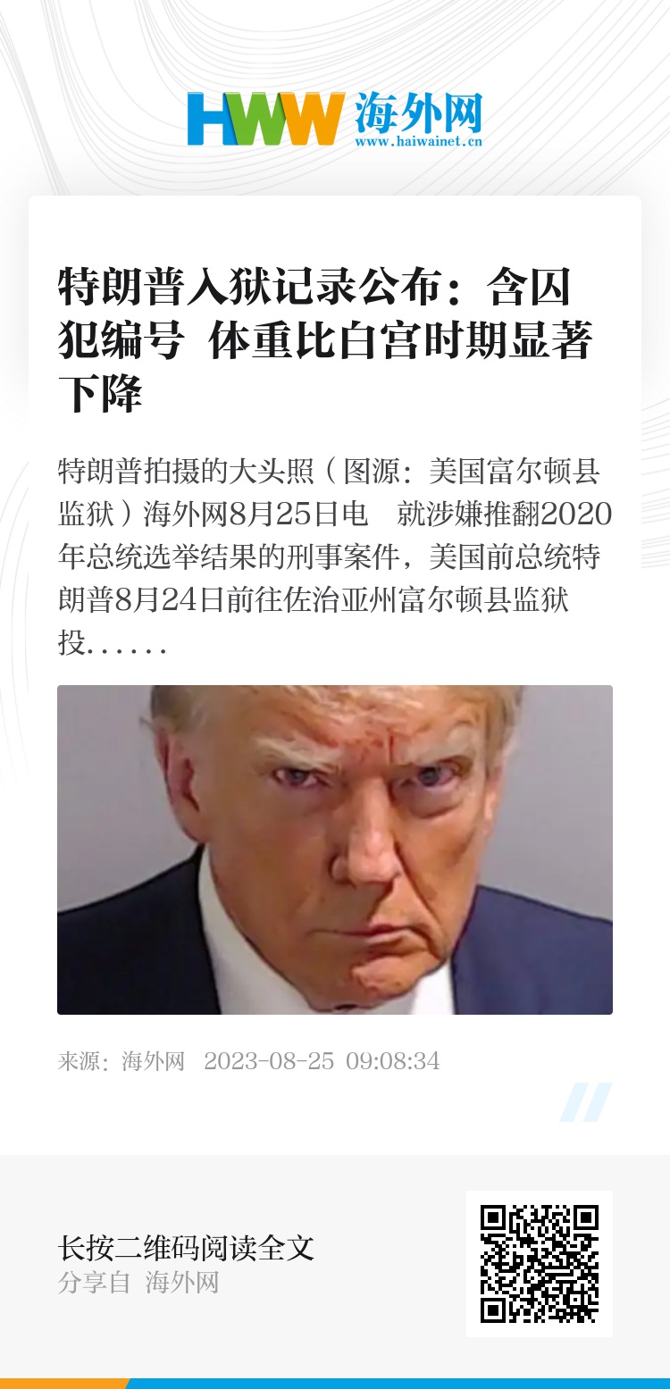 海外网8月25日电 就涉嫌推翻2020年总统选举结果的刑事案件,美国前总统特朗普8月24日前往佐治亚州富尔顿县监狱投案。美国《国会山报》当天公布了特朗普的入狱记录,包括囚犯编号、身高体重等。