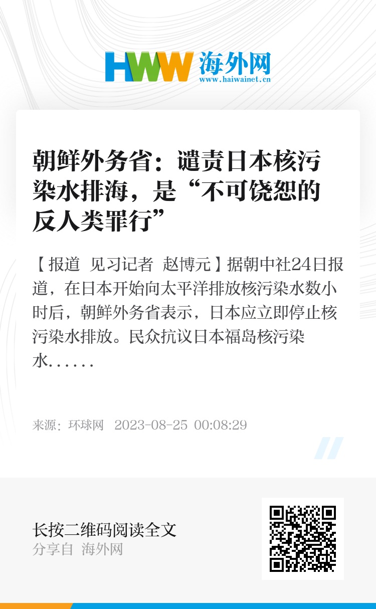 根据朝中社24日发布的朝鲜外务省声明,朝方对日本核污染水排放表示谴责,称这是“不可饶恕的反人类罪行”,日本将对此负责。