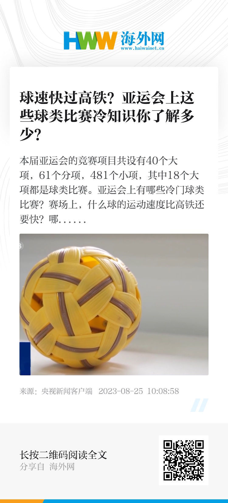 那么,在亚运会的球类运动项目中,你知道哪种球的球速最快吗?有一种球,它的最快球速甚至比高铁还要快,您猜到是什么了吗?