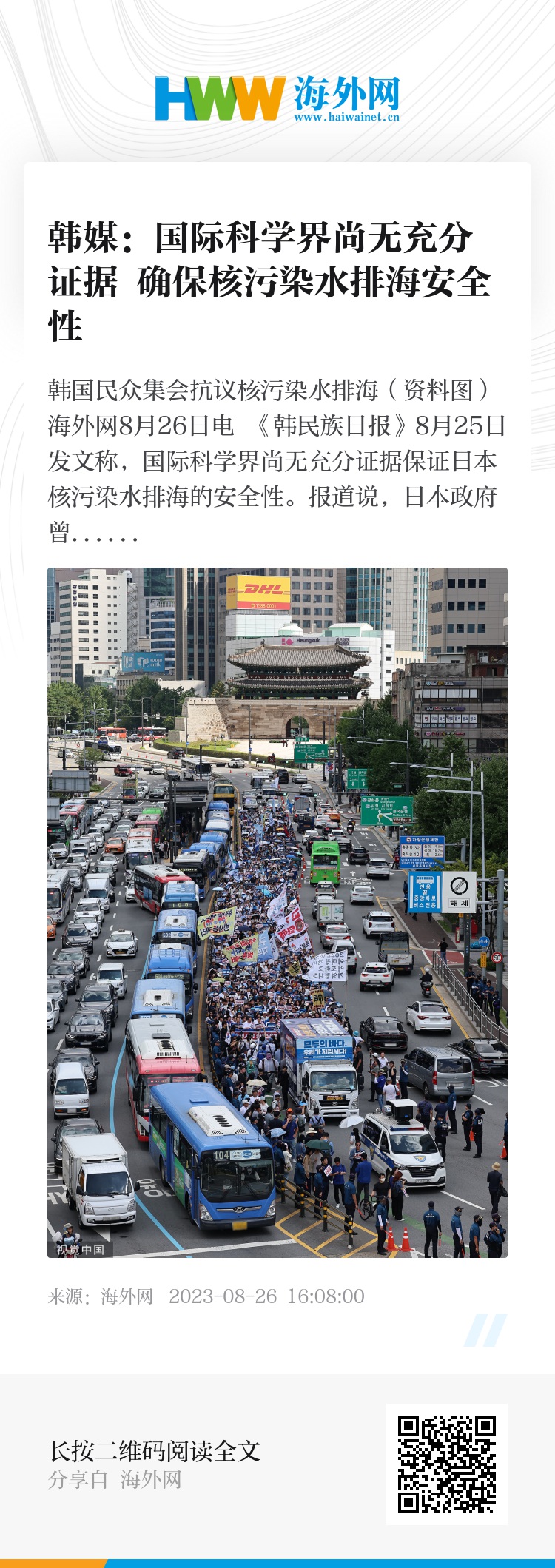 海外网8月26日电 《韩民族日报》8月25日发文称,国际科学界尚无充分证据保证日本核污染水排海的安全性。