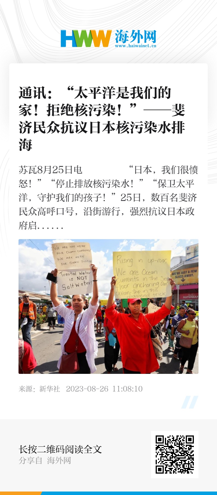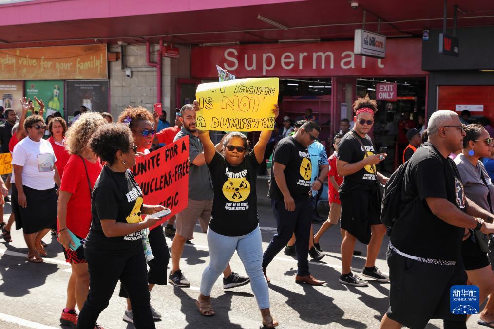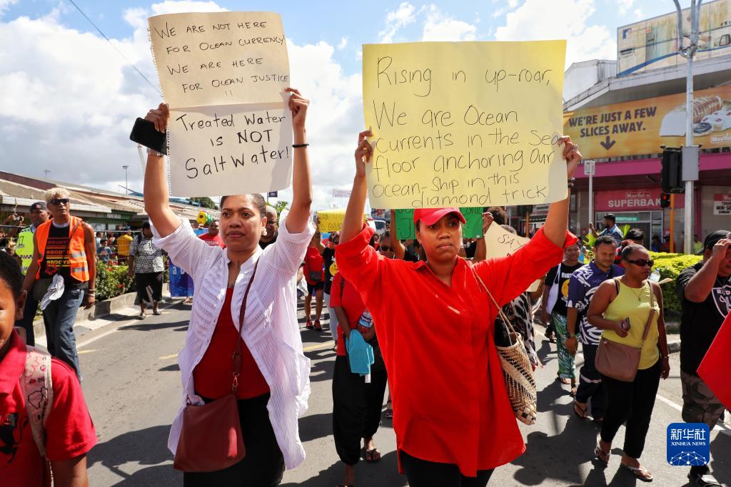 日本政府无视国际社会的强烈质疑和反对,于24日单方面强行启动福岛核事故污染水排海。斐济多个非政府组织成员以及各地民众25日聚集到首都苏瓦,举行游行和集会,谴责福岛核污染水排海。