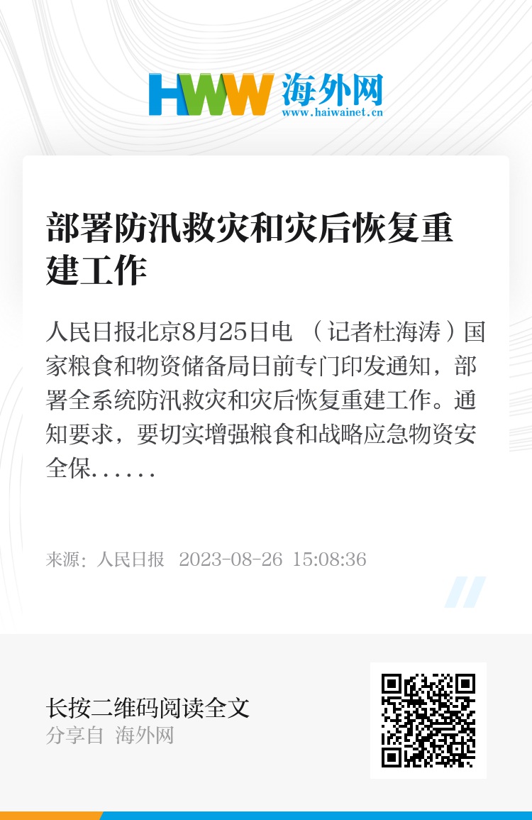 人民日报北京8月25日电 (记者杜海涛)国家粮食和物资储备局日前专门印发通知,部署全系统防汛救灾和灾后恢复重建工作。通知要求,要切实增强粮食和战略应急物资安全保障能力;加强农户科学储粮指导;统筹推进粮源调度、储备轮换、库存投放等。自入汛后首次调运中央应急物资以来,国家粮食和物资储备局累计向京津冀、东北、西北地区调运物资24批次,总价值10970万元。