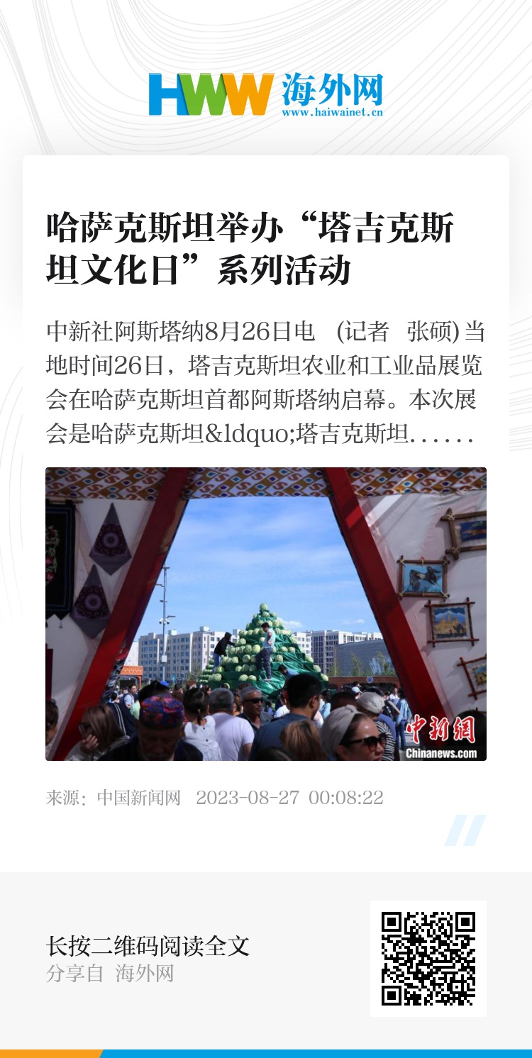 塔总统拉赫蒙表示,“文化日”及相关活动的举办,体现出两国关系的高水平发展。当下,两国关系保持了相互理解、尊重和信任,与哈深化各领域合作仍是塔外交政策优先事项。(完)