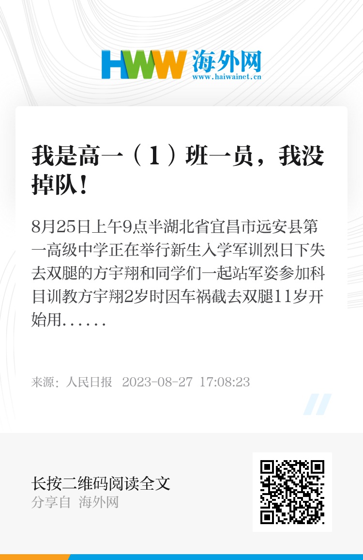 在今年6月结束的中考中方宇翔获得A等名列全县前100名以优异的成绩考入远安一高当被问及为何坚持参加军训时方宇翔笑得很灿烂他说,参加军训是个跟同学们一起成长的机会能增长克服困难的勇气和意志力“感谢教官、老师的支持鼓励我是高一(1)班一员我没掉队!”