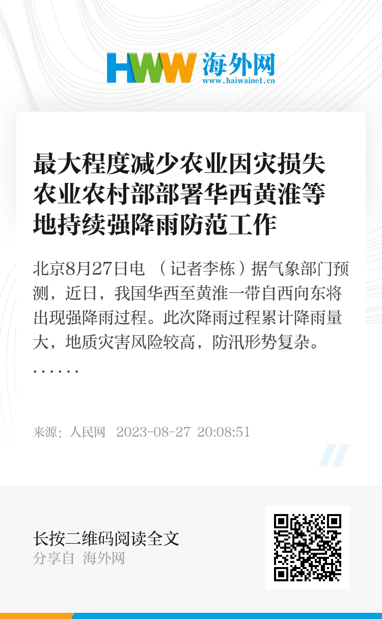 人民网北京8月27日电 (记者李栋)据气象部门预测,近日,我国华西至黄淮一带自西向东将出现强降雨过程。此次降雨过程累计降雨量大,地质灾害风险较高,防汛形势复杂。为切实抓好农业防汛抗洪救灾工作,农业农村部下发通知,要求各级农业农村部门立足抗灾夺丰收,科学有效应对,最大程度减少农业因灾损失。