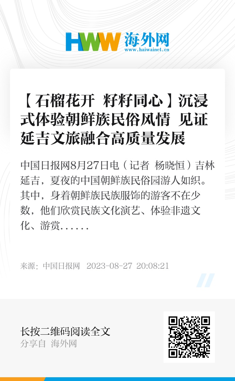中国日报网8月27日电(记者 杨晓恒)吉林延吉,夏夜的中国朝鲜族民俗园游人如织。其中,身着朝鲜族民族服饰的游客不在少数,他们欣赏民族文化演艺、体验非遗文化、游赏百年老宅……形成了延吉独特的旅游氛围,成为一道亮丽的民俗文化风景线,让延吉非遗文化“活”了起来、“火”了起来。