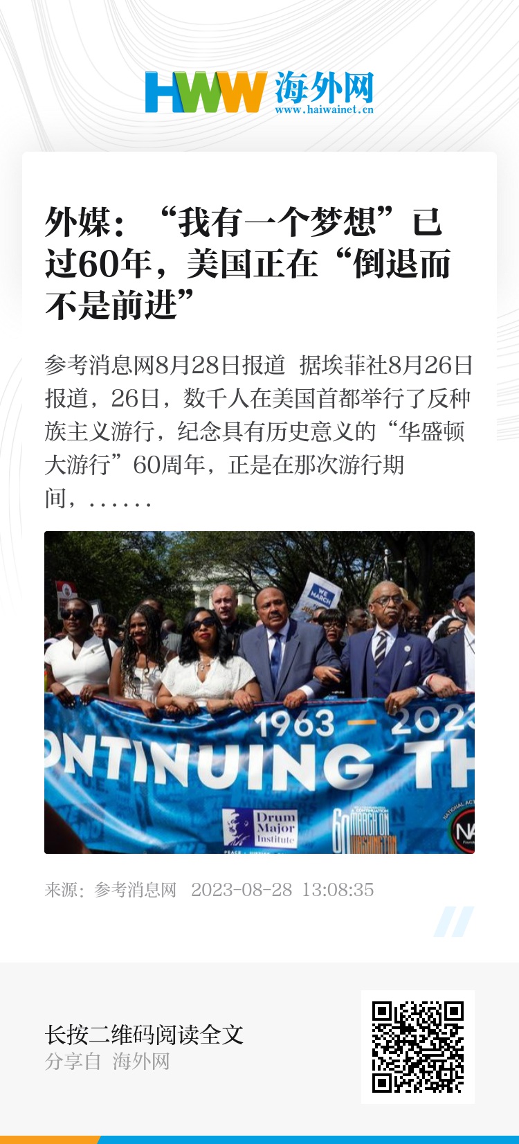 参考消息网8月28日报道 据埃菲社8月26日报道,26日,数千人在美国首都举行了反种族主义游行,纪念具有历史意义的“华盛顿大游行”60周年,正是在那次游行期间,美国民权运动领袖马丁·路德·金发表了广受赞誉的《我有一个梦想》演讲。