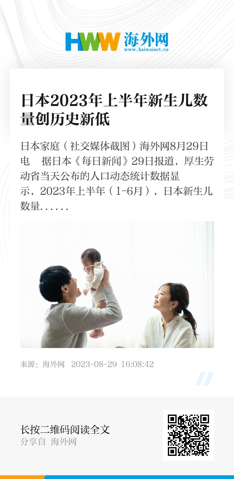 数据显示,日本今年上半年每月的新生儿数量都同比降低。2022年上半年,日本新生儿数量首次跌破40万人,今年的数据比2022年更低。《每日新闻》称,此次公布的数据包括了在日本居住的外国人和在外国居住的日本人数据,今后还将公布准确数据,只统计在日本居住的日本新生儿数量,数据可能比此次公布数据还低。