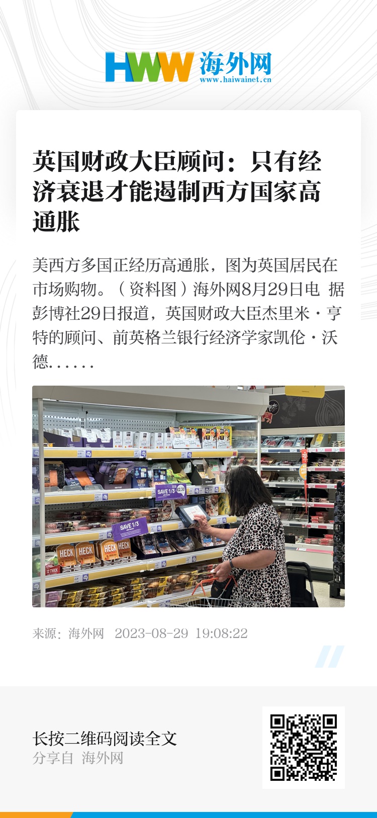海外网8月29日电 据彭博社29日报道,英国财政大臣杰里米·亨特的顾问、前英格兰银行经济学家凯伦·沃德当天表示,西方经济体可能无法在不陷入衰退的情况下摆脱高通胀。