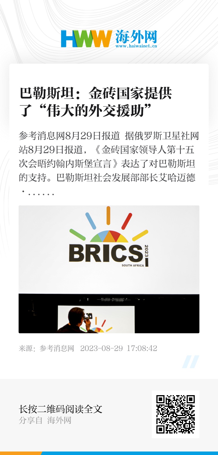 参考消息网8月29日报道 据俄罗斯卫星社网站8月29日报道,《金砖国家领导人第十五次会晤约翰内斯堡宣言》表达了对巴勒斯坦的支持。巴勒斯坦社会发展部部长艾哈迈德·马吉达拉尼在接受俄罗斯卫星社采访时指出,巴勒斯坦认为这种支持是使其能与以色列展开平等谈判的伟大的外交援助。
