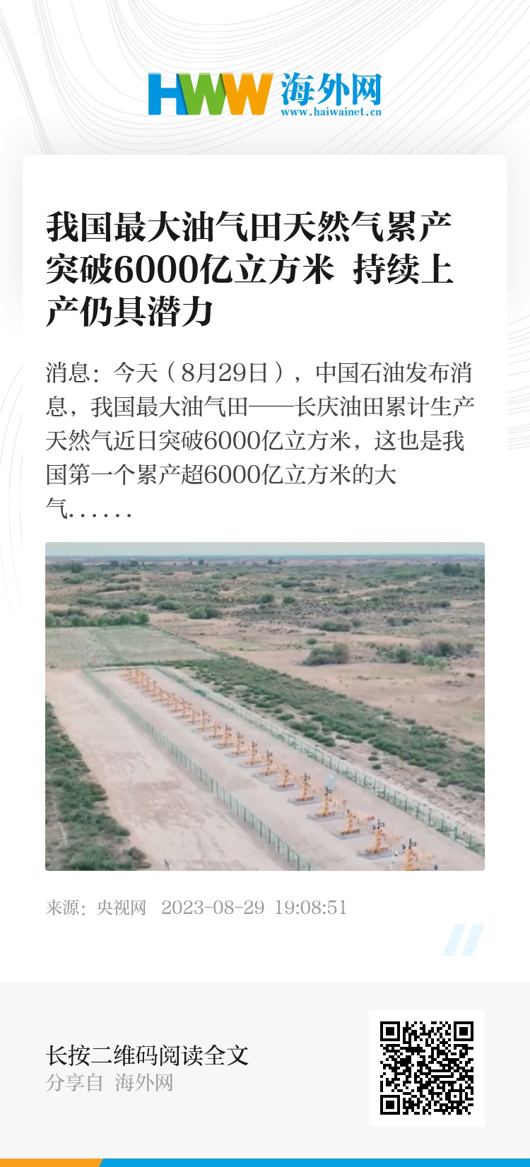 央视网消息:今天(8月29日),中国石油发布消息,我国最大油气田——长庆油田累计生产天然气近日突破6000亿立方米,这也是我国第一个累产超6000亿立方米的大气田。相当于我国2年的天然气消费总量,可替代标煤7.2亿吨,减少碳排放16.57亿吨,对优化国家能源结构、改善生态环境具有重要作用。
