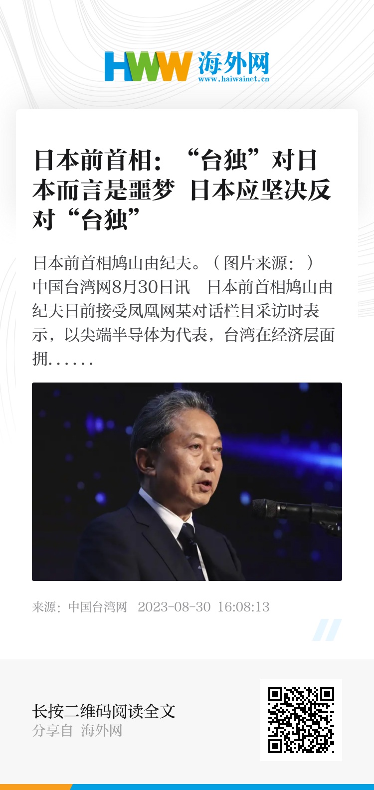 中国台湾网8月30日讯 日本前首相鸠山由纪夫日前接受凤凰网某对话栏目采访时表示,以尖端半导体为代表,台湾在经济层面拥有重要的世界影响力。关于台湾(与大陆)统一是否会威胁到日本的经济安全,这主要取决于统一方式是和平统一还是武力统一。