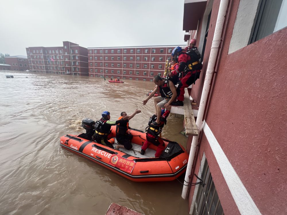 8月3日,山东消防济南增援分队在涿州市靖雅学校执行营救和疏散任务。新华社发(安雪松 摄)