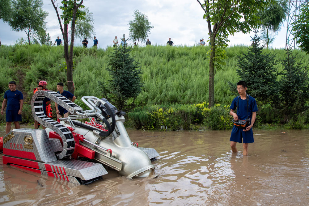 8月5日,在牡丹江市东安区大湾村附近,牡丹江市消防救援支队的消防员操控机器进行排涝。新华社记者 张涛 摄