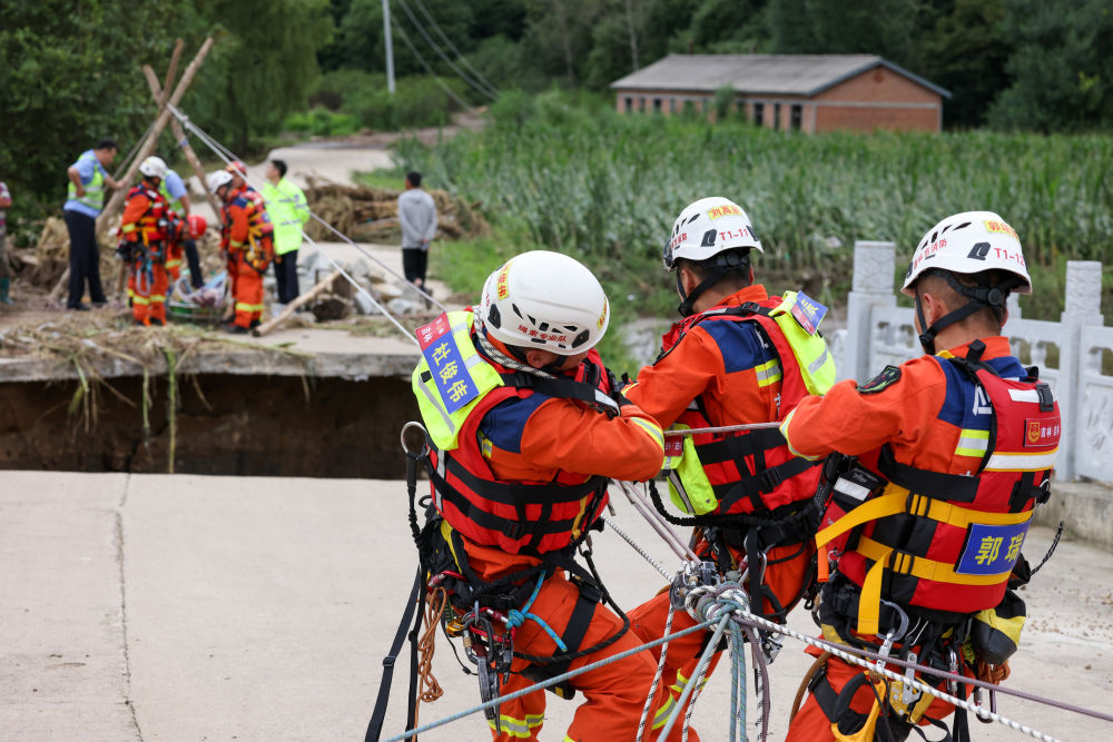 8月6日,吉林市消防救援支队队员利用绳桥解救受困村民。新华社记者 颜麟蕴 摄