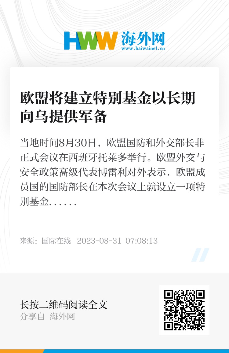 当地时间8月30日,欧盟国防和外交部长非正式会议在西班牙托莱多举行。欧盟外交与安全政策高级代表博雷利对外表示,欧盟成员国的国防部长在本次会议上就设立一项特别基金展开讨论。该基金计划提供每年50亿欧元的资金,用以长期向乌克兰提供军事装备。